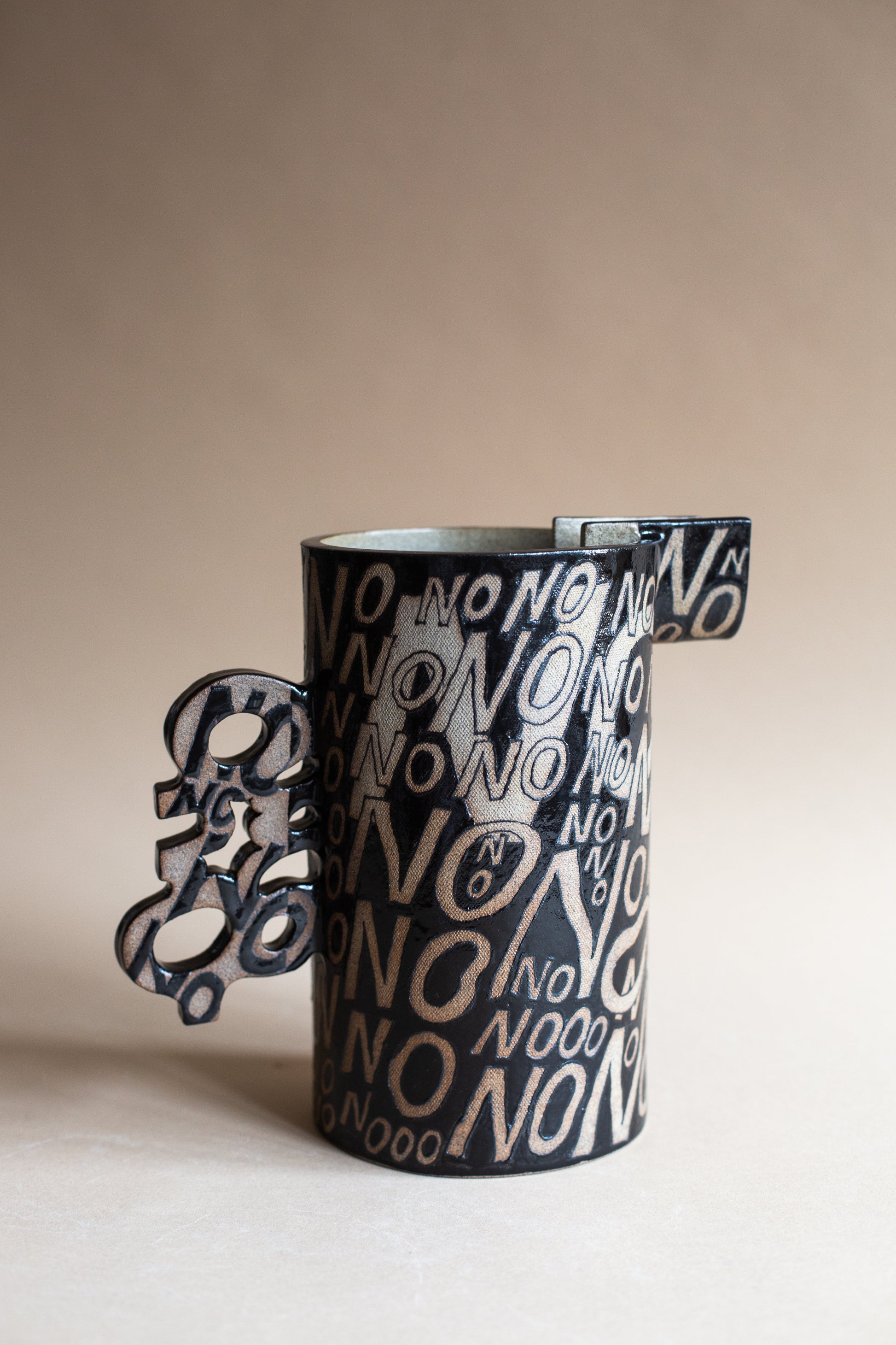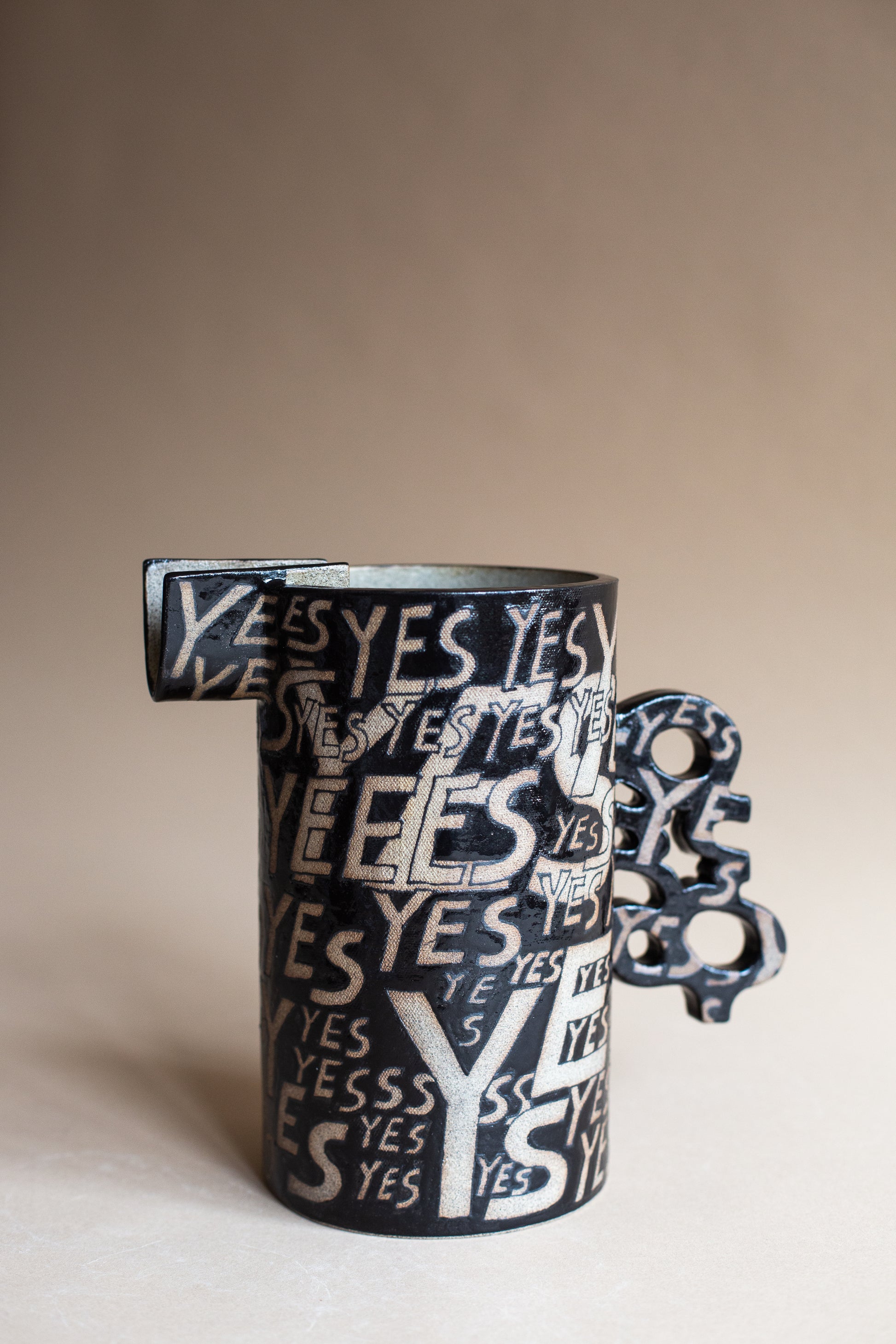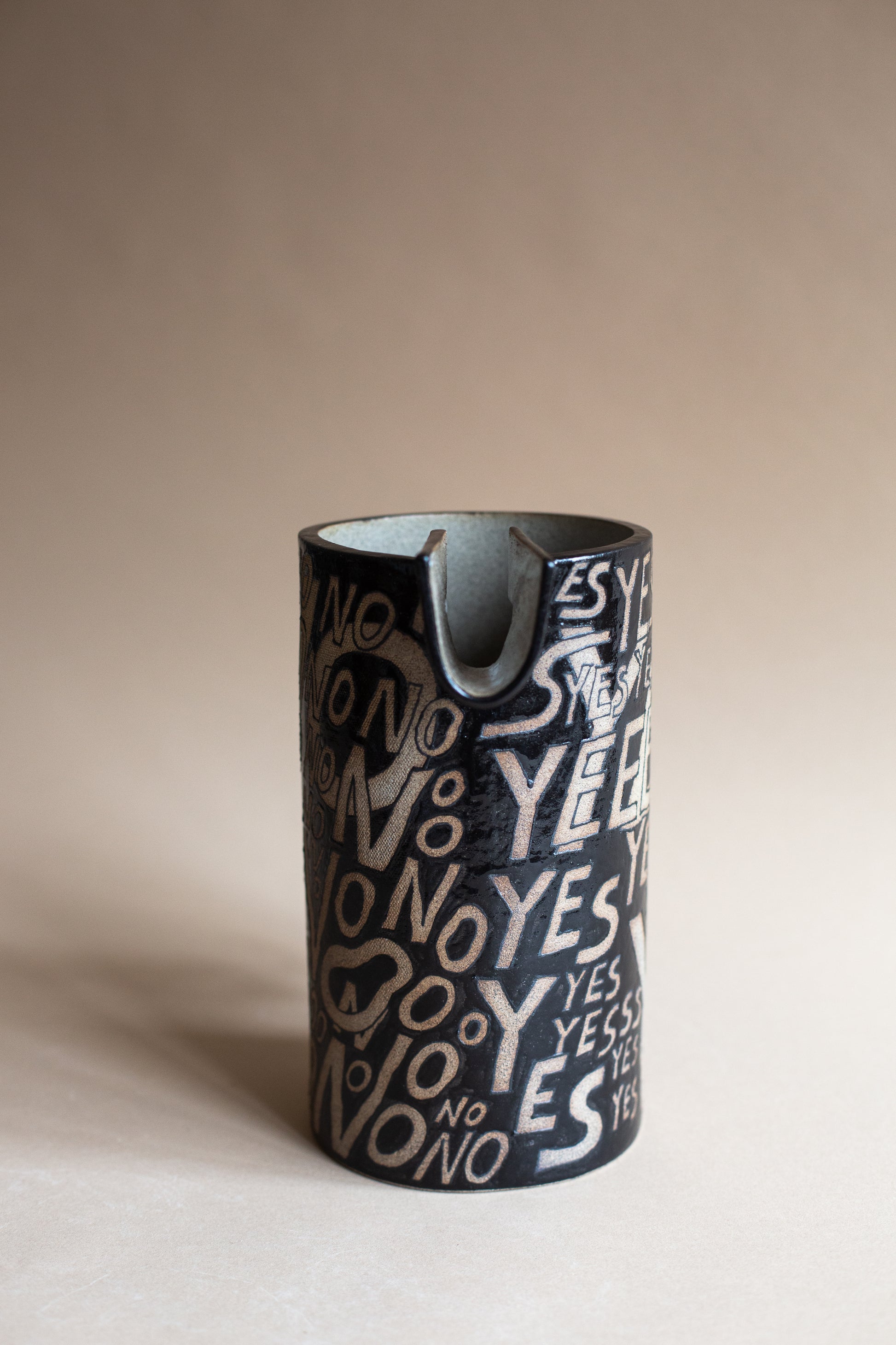The Maybe Jug was born after bringing to life the yes, no, and maybe vessels. I knew that the Maybe jug wanted to exist in form. This piece features a cacophony of NO's on one side, and a tapestry of YES's on the other. I hand-painted these words as I was navigating my own struggles (and joys) in understanding when I wanted to say No versus when I wanted to say Yes. I realised that I didn't always know when or how to say either. This piece is a visual and sculptural exploration of our own relationship to openness, resistance, self-trust, and choice.