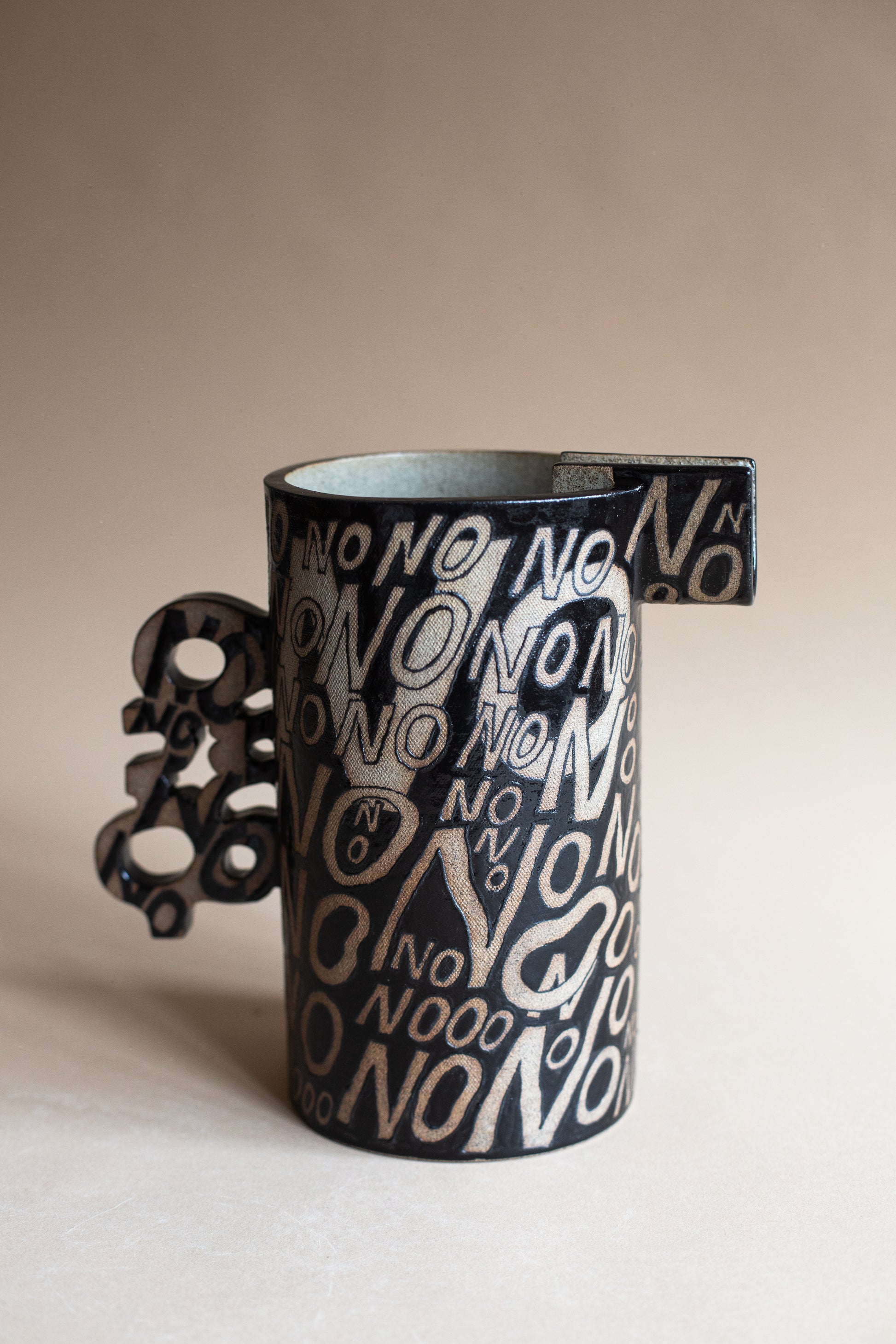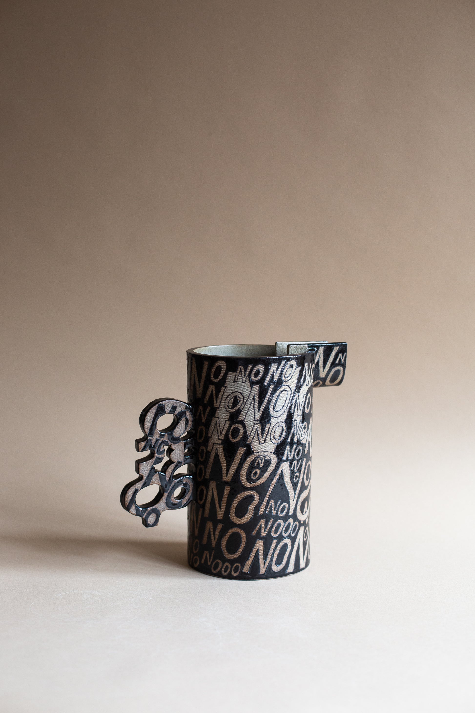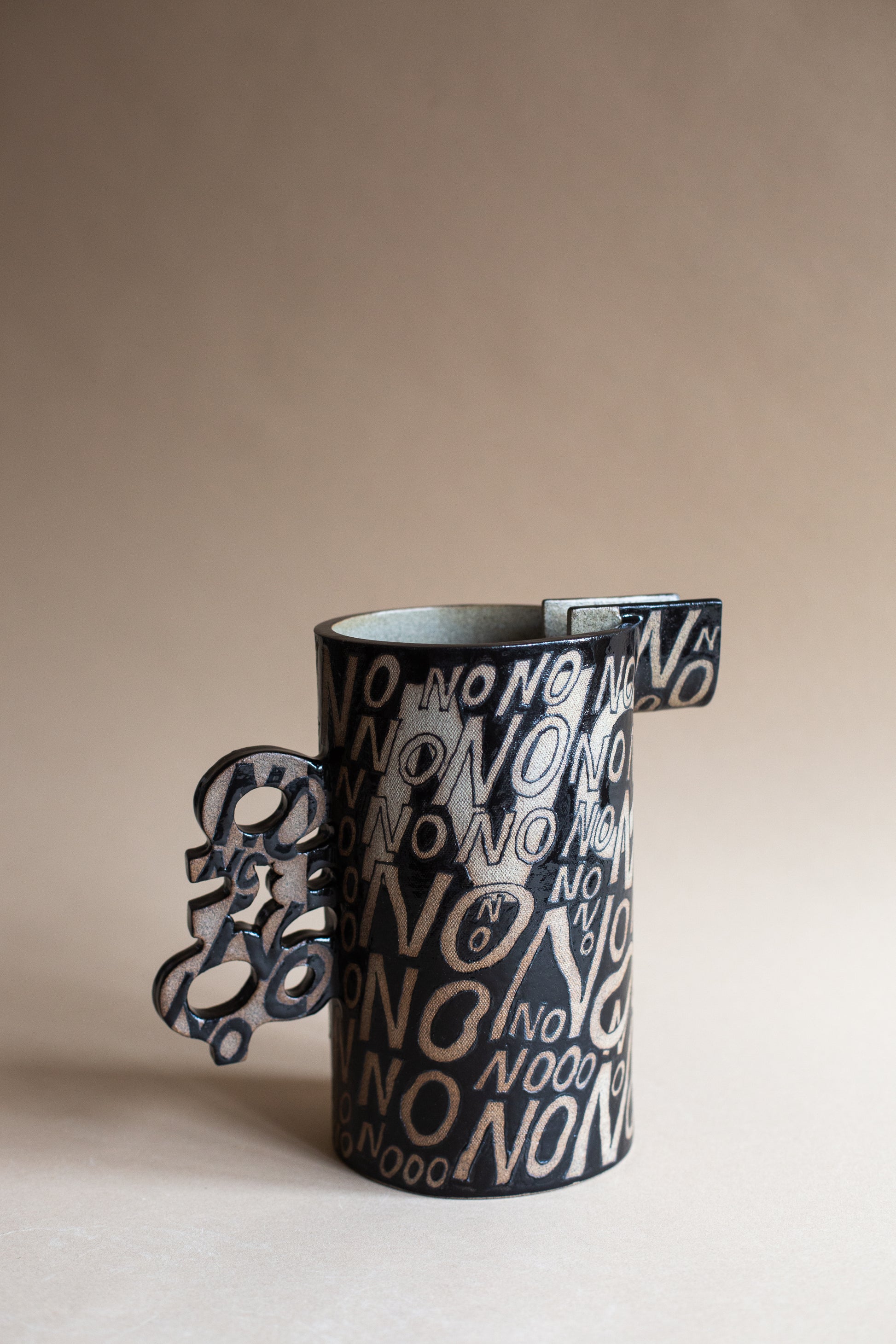 The Maybe Jug was born after bringing to life the yes, no, and maybe vessels. I knew that the Maybe jug wanted to exist in form. This piece features a cacophony of NO's on one side, and a tapestry of YES's on the other. I hand-painted these words as I was navigating my own struggles (and joys) in understanding when I wanted to say No versus when I wanted to say Yes. I realised that I didn't always know when or how to say either. This piece is a visual and sculptural exploration of our own relationship to openness, resistance, self-trust, and choice.