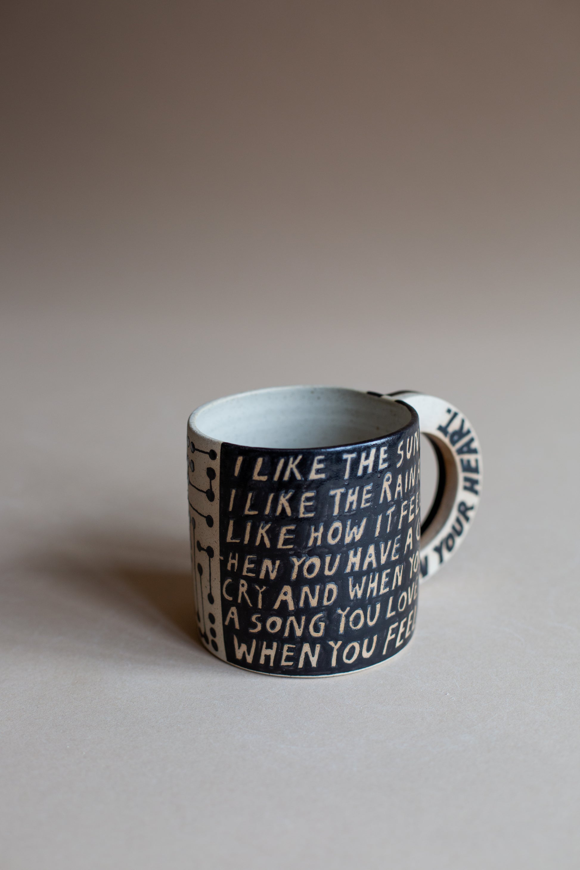 Black glaze on white stoneware clay. Hand-painted and one-of-a-kind. Fired twice at 1280°C.